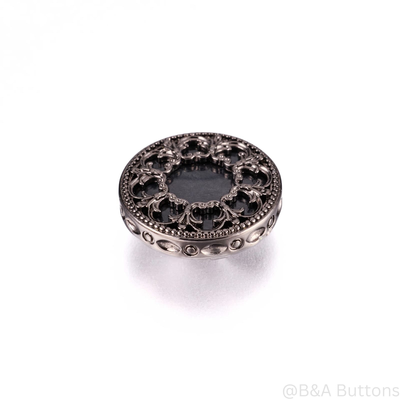 This button features an ornate and sophisticated design, showcasing a circular shape with intricate detailing. The outer edge is adorned with decorative filigree work that creates a beautiful lace-like effect. The center is a glossy black surface, which contrasts elegantly with the metallic finish surrounding it. The overall aesthetic combines classic charm with a modern touch, making it suitable for various styles.