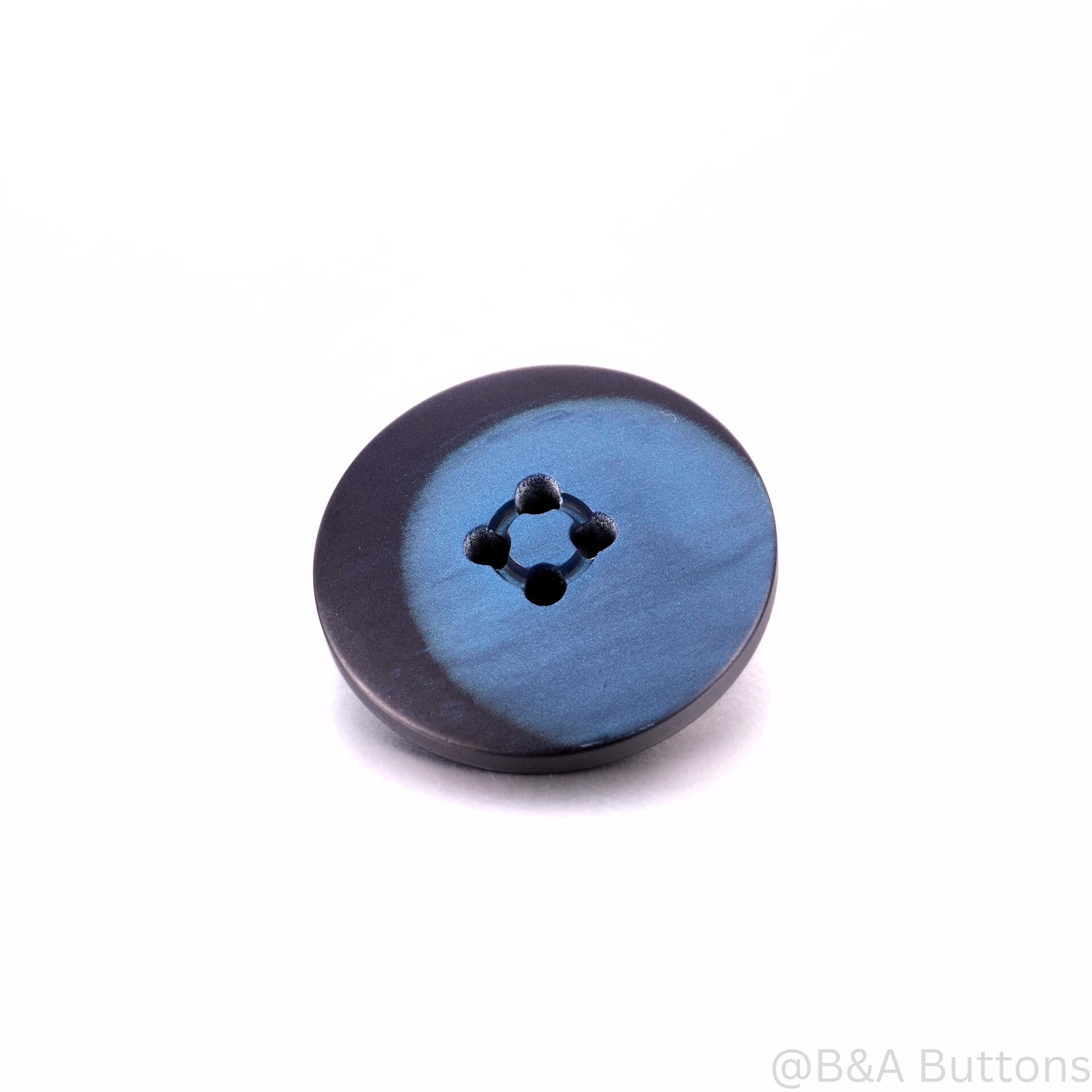 This button features a sleek, rounded shape with a deep, rich blue color that transitions into darker shades, creating an elegant, marbled effect. The surface has a smooth finish, and the button is adorned with four evenly spaced holes for fastening.