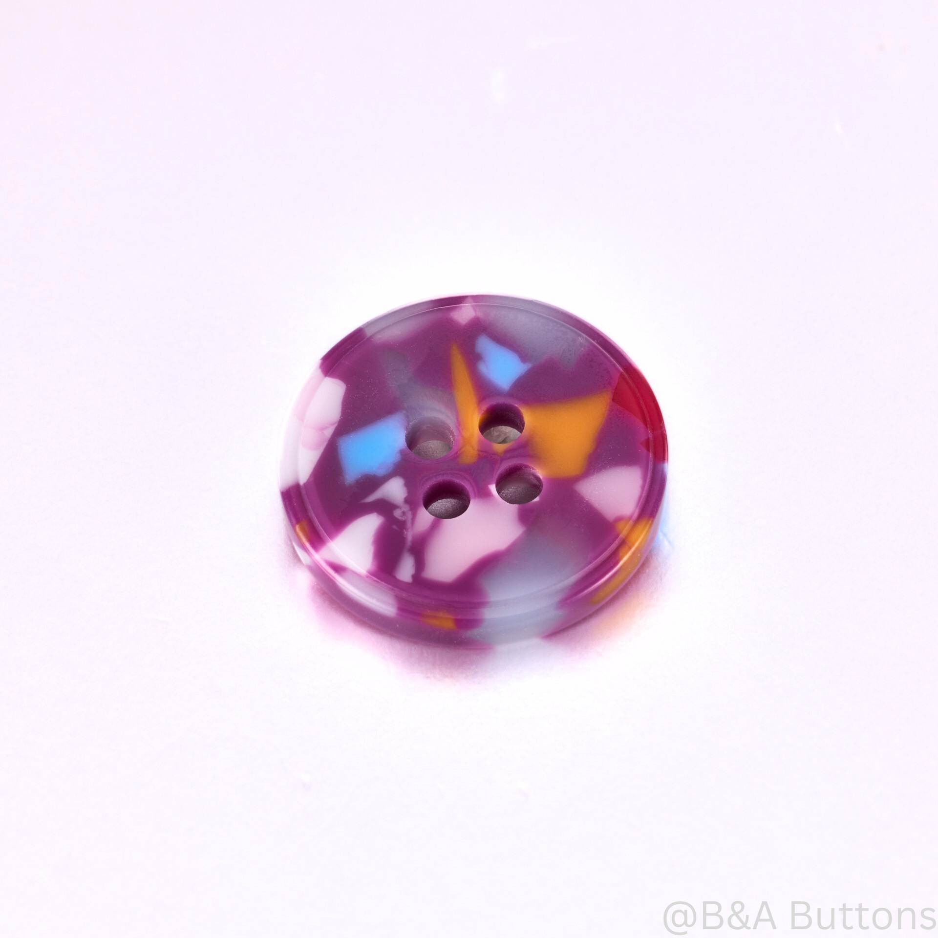The Colorburst Resin Button features a bold and dynamic design with swirls of vibrant purples, blues, and oranges scattered across a translucent resin surface. The playful mix of colors gives it a modern and youthful aesthetic, making it an eye-catching addition to any piece. It is perfect for adding a touch of fun and energy to your garments. The round shape and smooth finish offer a chic, polished look, while the colorful design gives it an extra flair.