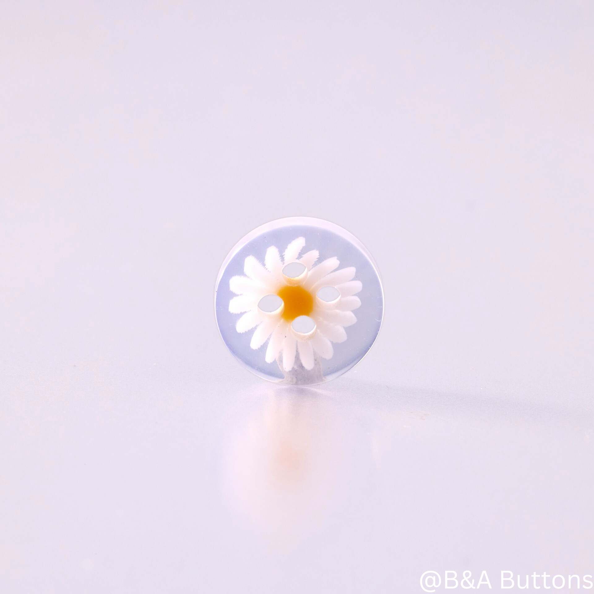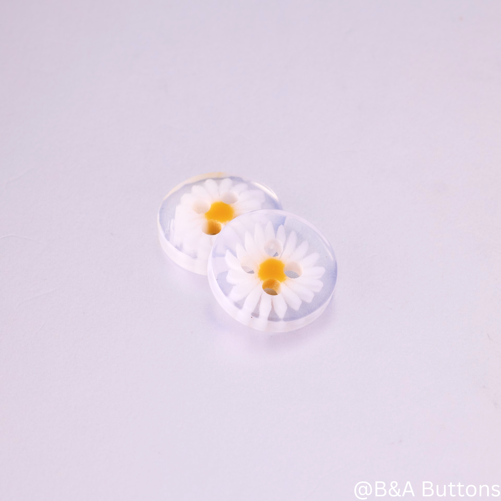 The buttons are round with a transparent resin base that features a 3D floral design. The flowers are composed of delicate white petals and a bright yellow center, creating a fresh, vibrant look.