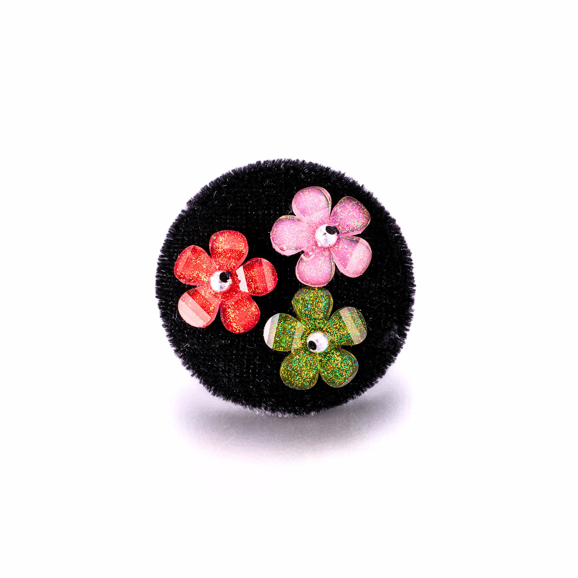 Glitter Blossom Trio Shank Buttons are colorful and playful, featuring a black base adorned with three glittery flower embellishments. Each flower has five petals and a small central rhinestone. The flowers are in three different colors: red, pink, and green, all with a glittery finish that catches the light.