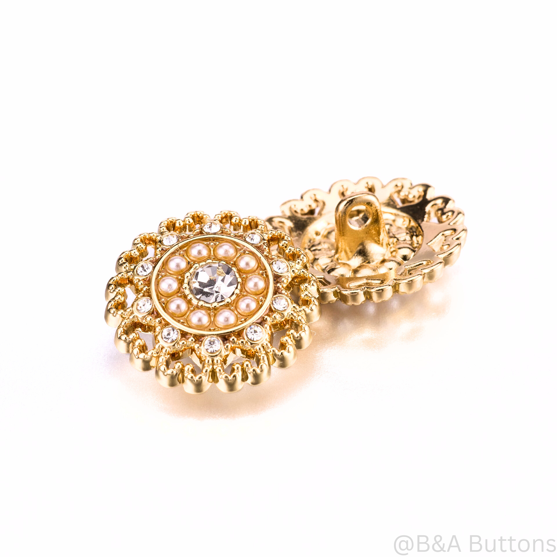 Pearl Accents: Surrounding the central crystal is a series of faux pearls, made from high-quality plastic. Specific uses: These luxurious buttons are ideal for enhancing high-end fashion garments, such as couture dresses and designer coats, by adding an elegant touch of sparkle and sophistication. They can also be used to elevate accessories like handbags, hats, or shoes, transforming them into statement pieces with their intricate design and opulent finish.