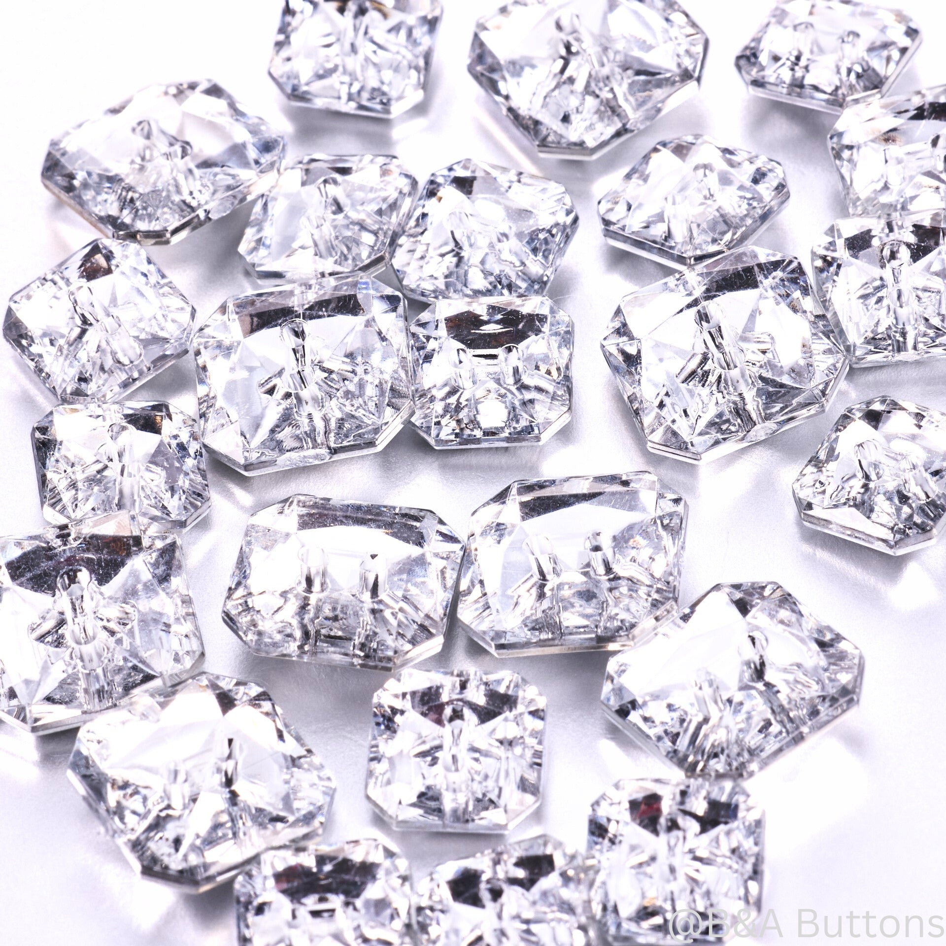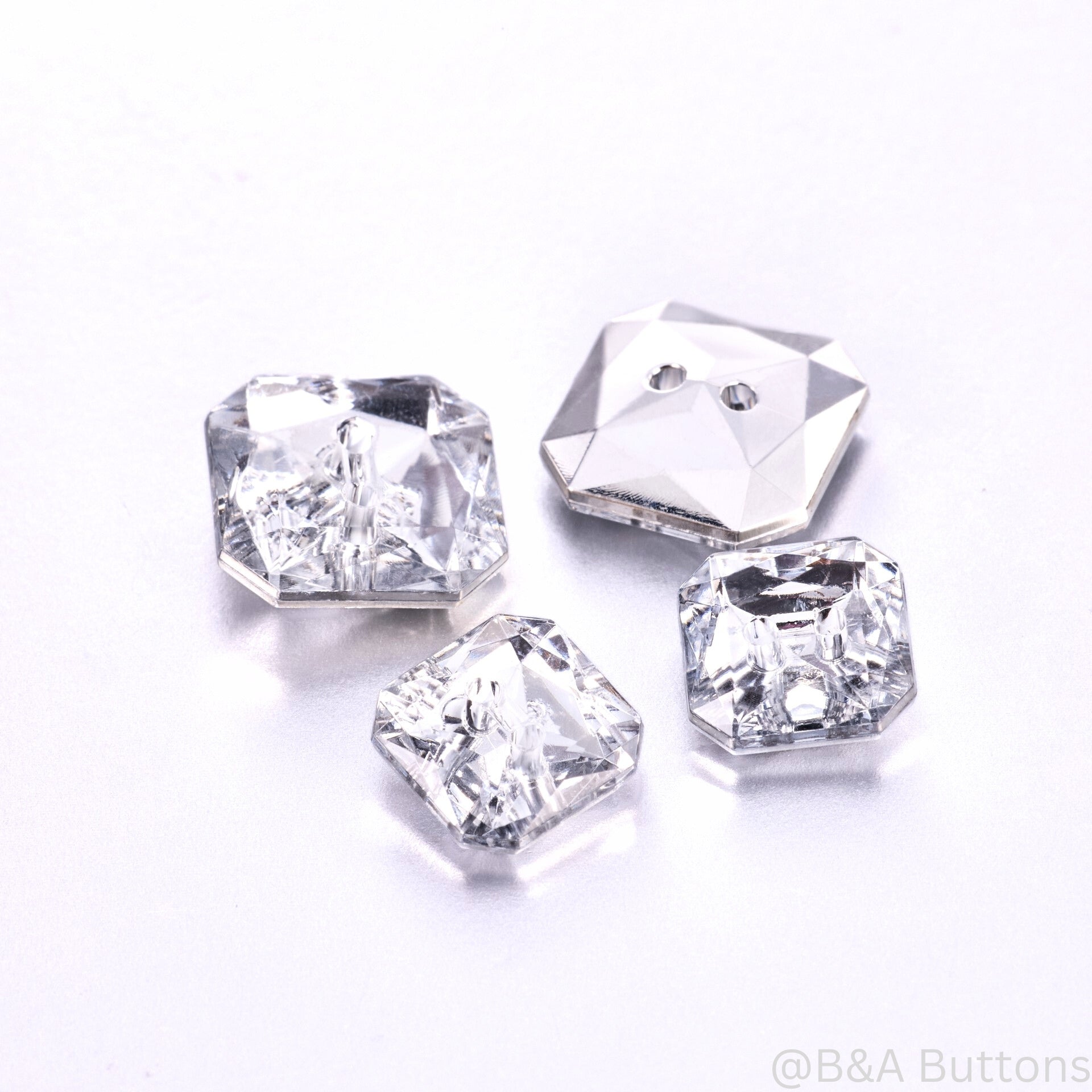 These buttons are crafted from high-quality, transparent acrylic, which mimics the appearance of faceted gemstones, providing a brilliant and multifaceted shine.