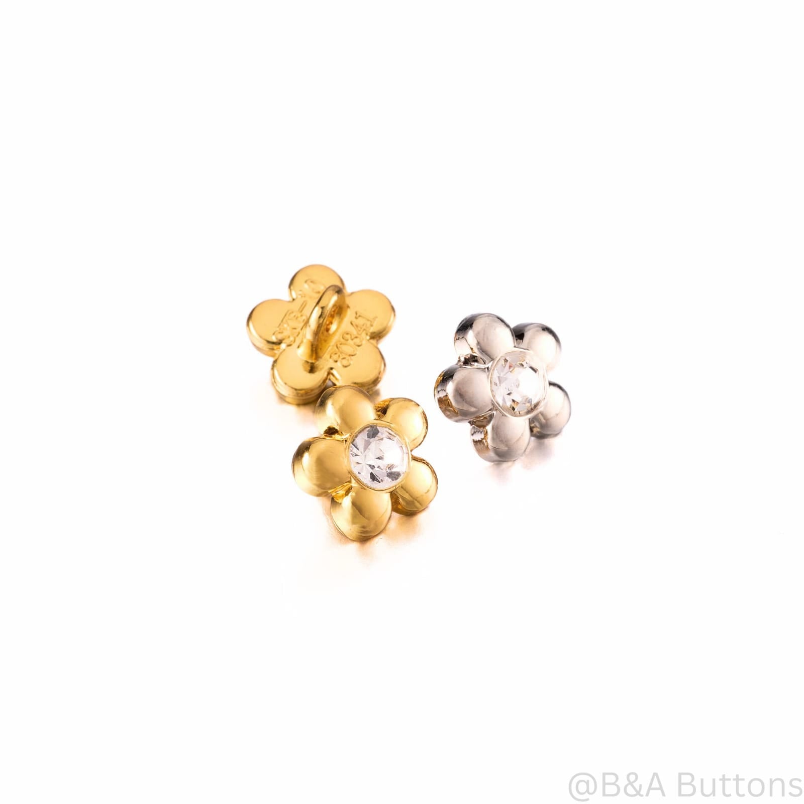 - Center: Like the gold flower button, it features a clear, round gem at the center, likely a crystal.